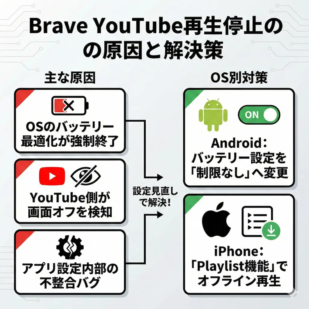 BraveのYouTubeバックグラウンド再生が止まる!iPhone・Androidの対策方法