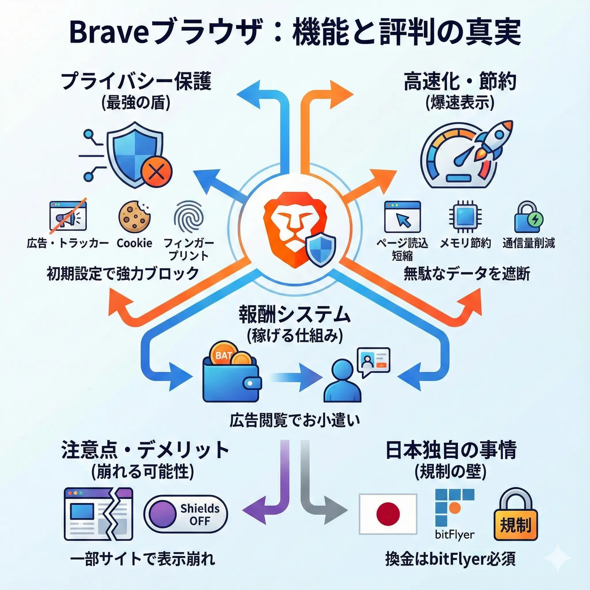 しかし、ネット上には「中国製のスパイウェアではないか」「稼げなくなった」「バッテリーを消費する」といったネガティブな噂も飛び交っています。本記事では、最新のデータと私の実体験を基に、Braveブラウザの真実を包み隠さず解説します。メリットだけでなく、デメリットや日本特有の事情についても詳しく触れていきます。