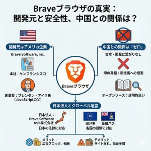 ネット上でまことしやかに囁かれる「Braveは中国企業」という噂は、完全な誤解です。Brave Software, Inc.は米国サンフランシスコに拠点を置く米国企業であり、PayPal創業者ピーター・ティール氏のファンドなどから出資を受けています。私が企業の背景を調べたところ、カリフォルニア州の消費者プライバシー法(CCPA)やGDPRに準拠した厳格な運営が行われていました。