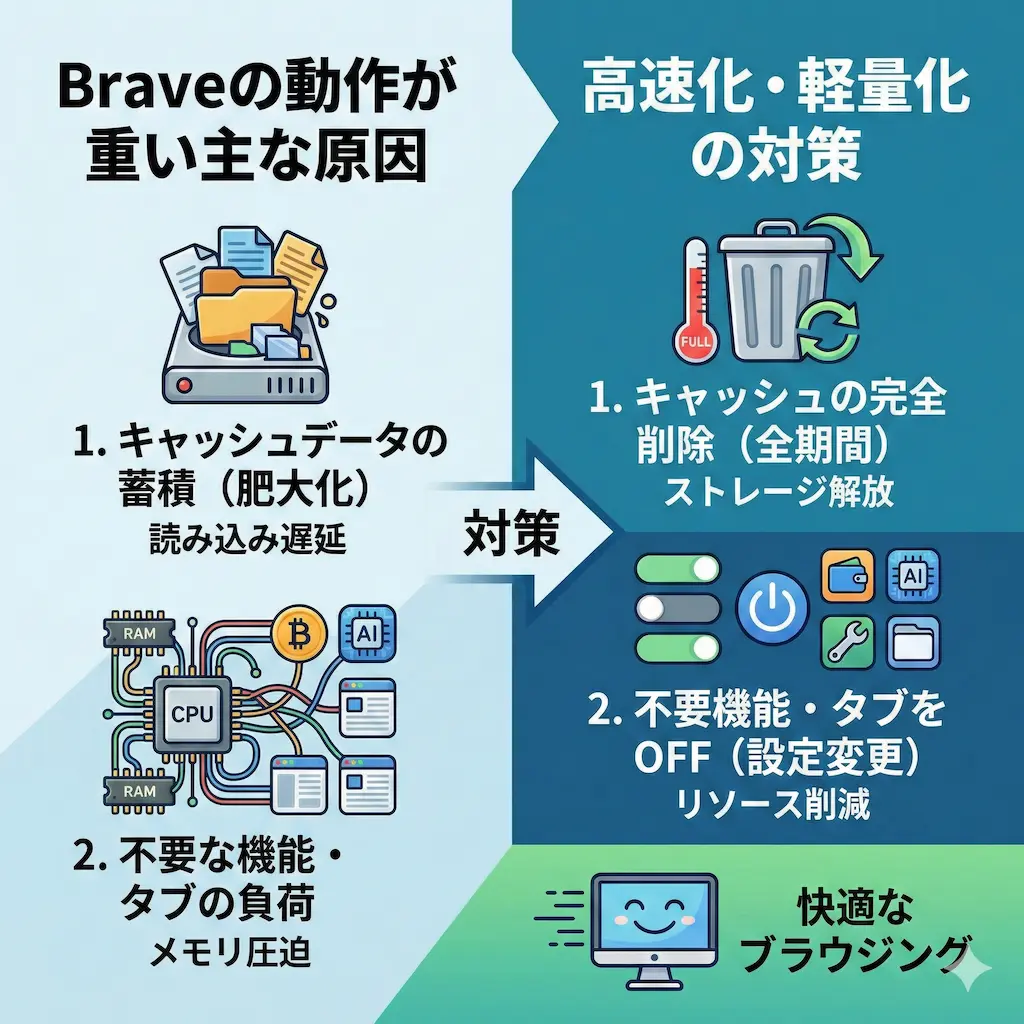 私が愛用しているBraveブラウザの動作が重くなると、日々の作業効率が著しく低下します。ページを開くたびに数秒の待機時間が発生するのはストレスです。