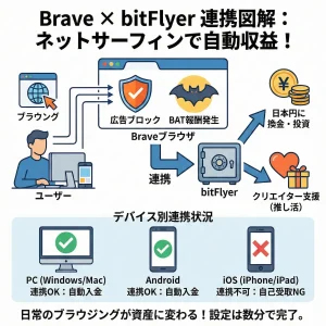 日本国内でBraveの報酬を受け取るには、暗号資産取引所bitFlyerとのアカウント連携が絶対条件です。日本の法律を遵守するため、本人確認を完了した口座が必要になります。