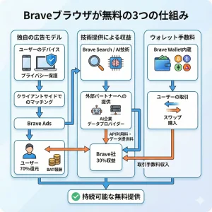 Braveは独自の広告配信エコシステムを持っており、ユーザーがプライバシーを損なわない形で収益を得ています。従来のブラウザとは異なるビジネスモデルを採用しているため、無料での提供が成り立ちます。