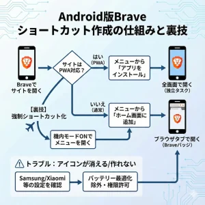 Android端末でBraveを頻繁に利用するなら、ホーム画面にショートカットを追加するのが便利です。ブラウザのメニューから「ホーム画面に追加」を選択するだけで完了します。