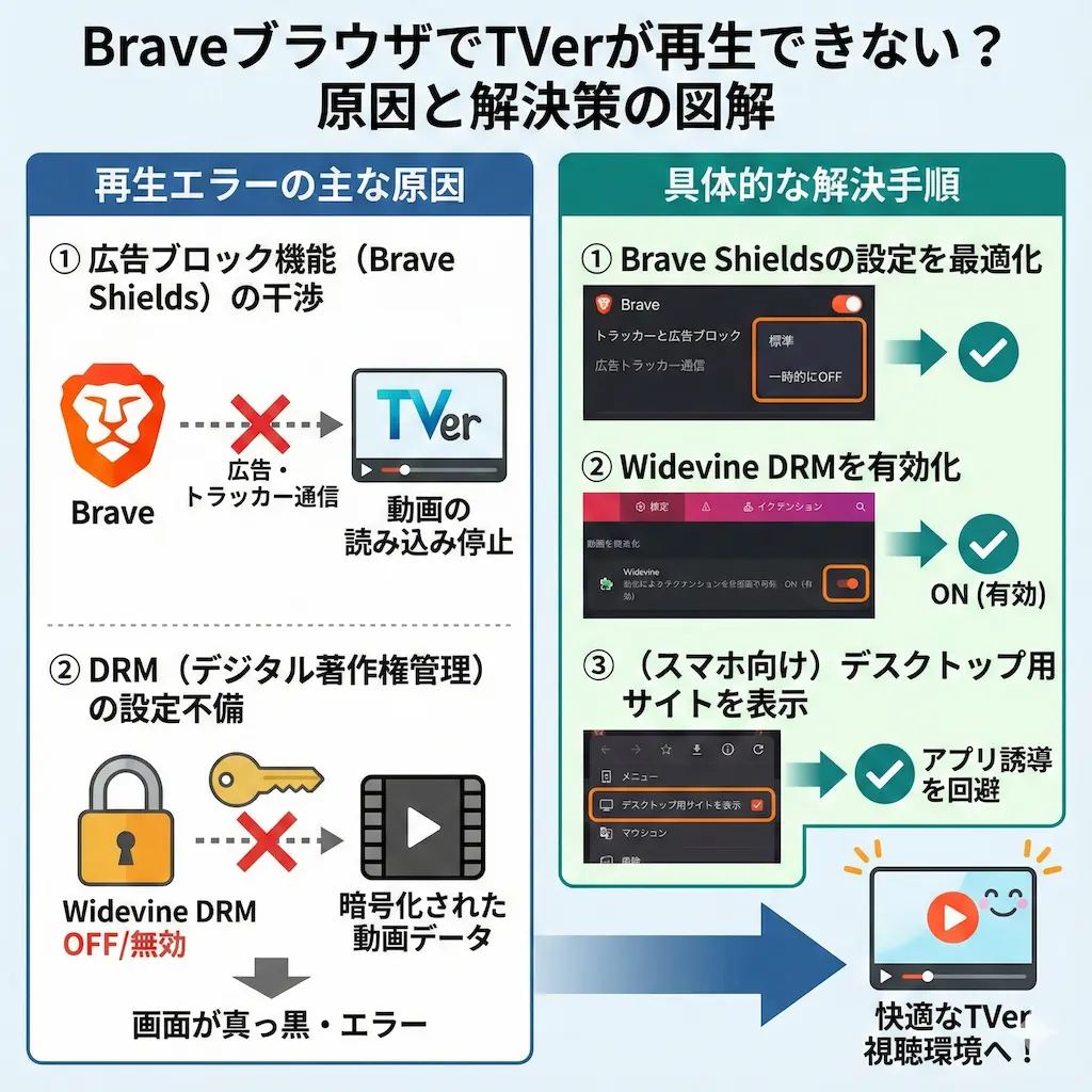Braveブラウザを使ってTVerを視聴しようとすると、画面が真っ黒になったりエラーが出たりすることがあります。私は普段からBraveを愛用していますが、動画配信サービスとの相性には工夫が必要だと実感しています。 広告をブロックする機能が優秀すぎるため... -
