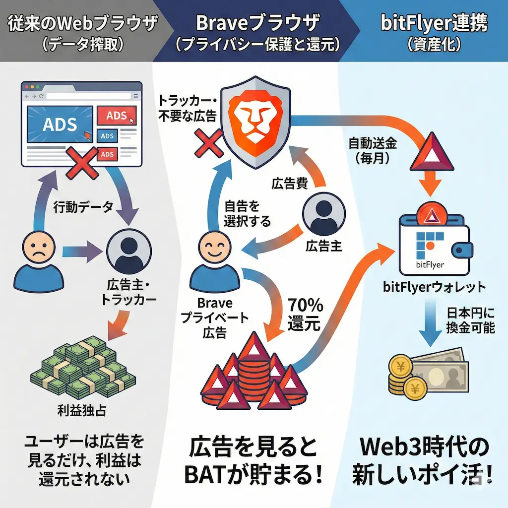 2026年現在、インターネット上の「注意(アテンション)」は金銭的な価値を持つ資産として認識されています。これまでのWebブラウザはユーザーの行動データを収集し、広告主が利益を独占する構造でした。 私が愛用しているBraveブラウザは、この常識を根本... -